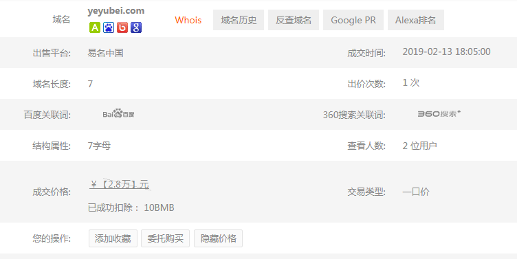 近日,有米农曝料称,他于2017年手工注册的域名yeyubei.com以28000元的价格通过易名中国一口价平台被秒走了。持有成本120元,利润高达233倍。